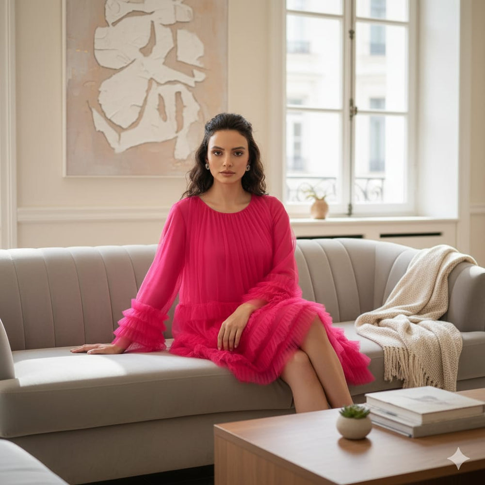 Elevate your wardrobe with this knee-length dress featuring delicate long sleeves and a subtle mesh overlay. The soft yellow hue enhances your natural glow, while ruffled hems add a refined touch of femininity. Designed for graceful movement and effortless elegance, this dress is perfect for occasions where sophistication meets comfort.